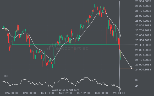 NAS100 has broken through a support line. Because it has previously retraced from this price, you should wait for confirmation of the breakout before trading. It has touched this line multiple times over the past 19 days, which suggests a possible target around 24923.1621 within the next 3 days.