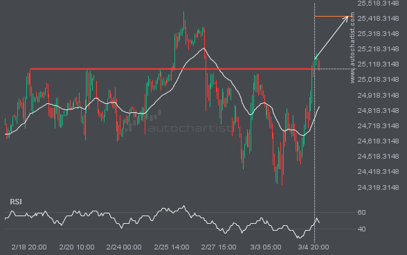 A strong resistance level has been breached at 25087.2480 on the 1 hour NAS100 chart. Technical analysis forecasts a move to 25431.5938 within the next 2 days.