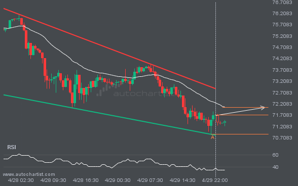 XAGUSD is trapped in a Falling Wedge formation, implying that a breakout is imminent. This is a strong trade setup for both trend and swing traders. It is now approaching a support line that has been tested before. Divergence watchers may be optimistic about a potential breakout, which could mark the start of a new trend. This confluence could also create an ideal setup for swing traders looking for a potential bounce. Whatever happens, an initial move toward 72.0535 is expected in the short term.