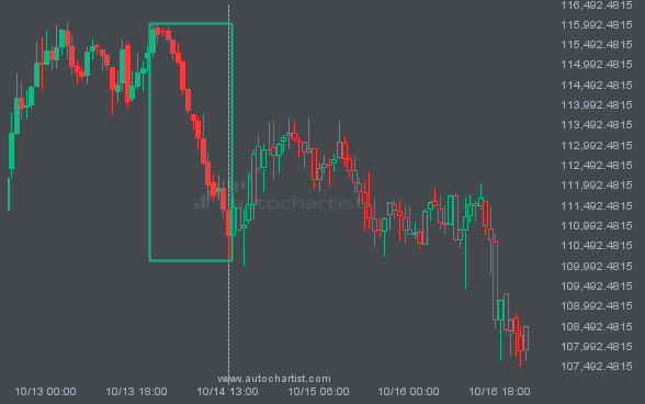 Triangle pattern identified on GBPJPY has broken through a support level with the price momentum continuing to move in an downward direction. A solid trading opportunity continues with the price expected to reach 200.3103 in the next 3.