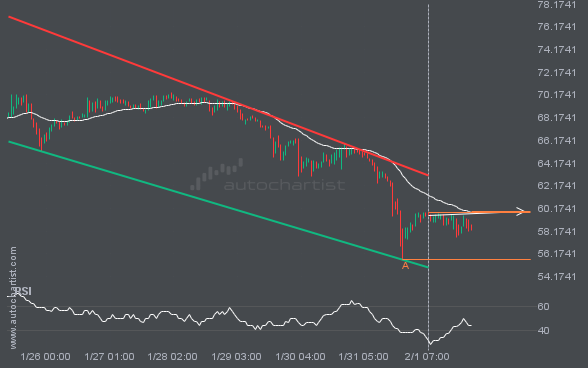 BRN/USD is moving toward a support line. Because it has retraced from this level in the past, we may see either a breakout through this line or a rebound to current levels. It has touched this line multiple times over the last 16 days and may test it again within the next 3 days.