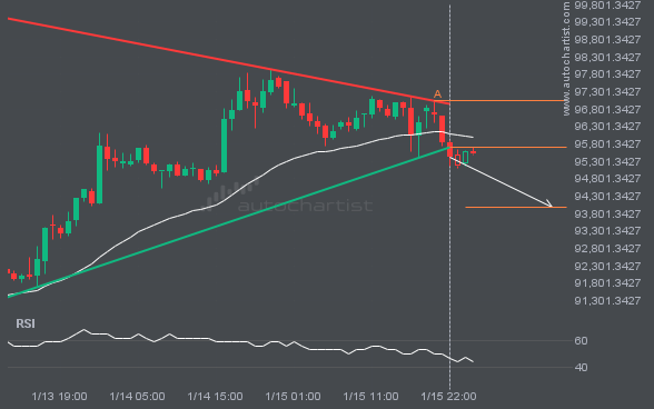BTCUSD has broken through the support line, which it has tested twice before. We have seen it retrace from this line before, so wait for confirmation of the breakout before trading. If this new trend persists, a target level around 93969.6210 may materialize within the next 14 hours.