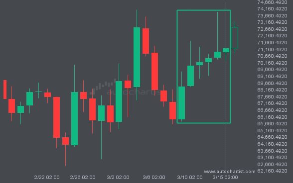 BTCUSD saw a large number of bullish candles that reached 71214.9900 over 7 days.