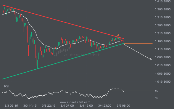 XAUUSD has broken through the support line of a Triangle pattern and suggests a possible move to 5051.3372 within the next 16 hours. It has tested this line before, so it is prudent to wait for confirmation of the breakout before taking action. If the breakout is not confirmed, we could see a retracement back to levels seen over the last 3 days.