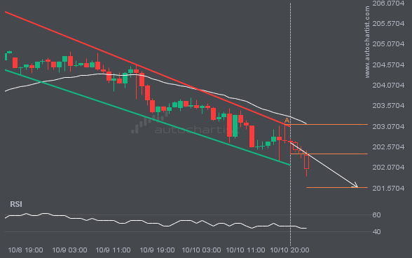 A Channel Down pattern was identified on GBPJPY at 202.397, creating an expectation that it may move to the support line at 201.5819. It may break through that line and continue the bearish trend or it may reverse from that line.