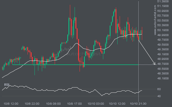 The movement of XAGUSD towards 48.7532 price line is yet another test of the line it reached numerous times in the past. We could expect this test to happen in the next 11 hours, but it is uncertain whether it will result in a breakout through this line, or simply rebound back to current lines.