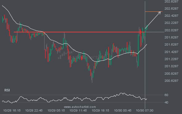 GBPJPY has broken through 201.9750 which it has tested numerous times in the past. We have seen it retrace from this price in the past. If this new trend persists, GBPJPY may be heading towards 202.5424 within the next 9 hours.