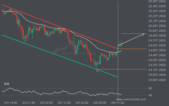 NAS100 has broken through the resistance line of a Channel Down pattern and suggests a possible move to 24898.8753 within the next 13 hours. It has tested this line before, so it is prudent to wait for confirmation of the breakout before taking action. If the breakout is not confirmed, we could see a retracement […]
