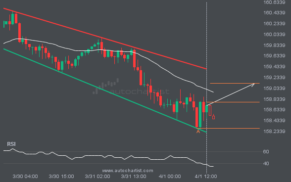 USDJPY is moving toward a resistance line. Since it has retraced from this line before, we may see either a breakout through it or a rebound to current levels. It has touched this line multiple times in the past 12 days and may test it again within the next 2 days.