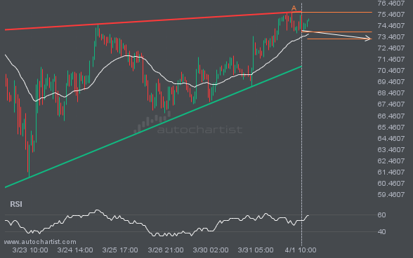 An emerging Ascending Triangle pattern in its final wave has been identified on the XAGUSD 1 hour chart. After a strong bullish run, XAGUSD is heading toward the upper triangle trendline, with possible resistance at 74.5846. If the resistance holds, the Ascending Triangle pattern suggests a rebound toward current levels.