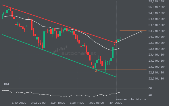 The last 20 4 hour candles on FTSE100 have formed a Triangle pattern and broken out through the pattern lines, indicating a possible bullish movement toward the price level at 10243.9850.