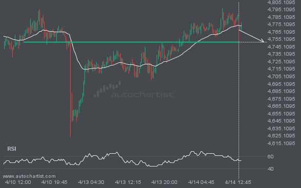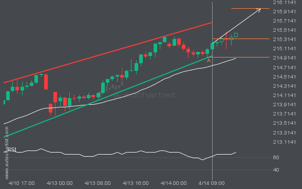 GBPJPY is moving toward a resistance line. Since it has retraced from this line before, we may see either a breakout through this line or a rebound to current levels. It has touched this line numerous times in the last 6 days and may test it again within the next 8 hours.
