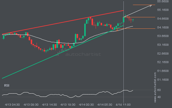 An emerging Rising Wedge has been detected on LTCUSD. The pattern has not yet broken through support, but the price is expected to move up over the next few hours. At the time the pattern was found, the price was 54.75, and it is expected to move to 55.4495.
