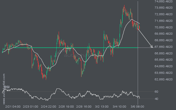 BTCUSD is heading toward 67528.5938 and could reach this level within the next 4 days. It has tested this level numerous times in the past, and this time could be no different, ending in a rebound rather than a breakout. If a breakout does not occur, we may see a retracement back to current levels.