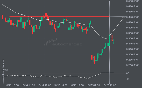 FTSE100 is heading towards 9455.8301 and could reach this point within the next 23 hours. It has tested this line numerous times in the past, and this time could be no different, ending in a rebound instead of a breakout. If the breakout doesn’t happen, we could see a retracement back down to current levels.