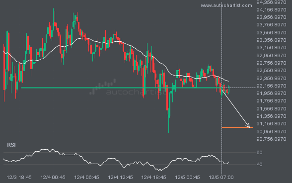 BTCUSD has broken through a support line. Since it has previously retraced from this price, wait for confirmation of the breakout before trading. It has touched this line several times over the past 2 days. This suggests a possible target around 91051.9922 within the next 7 hours.