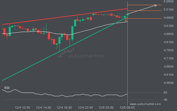 A Rising Wedge pattern was identified for NGC/USD at 5.0025, suggesting it may move toward the resistance line at 5.0378. It may break through that line and continue the bullish trend, or reverse from it.