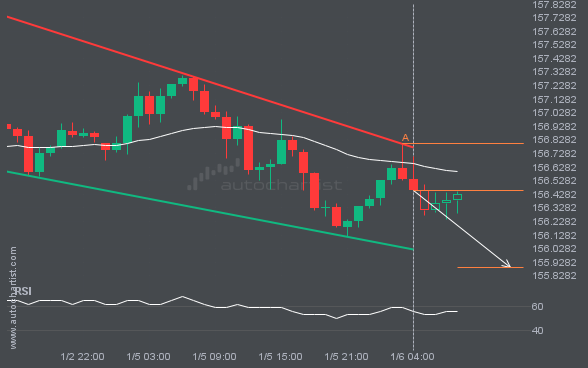 USDJPY is moving toward a support line. Since it has retraced from this line before, we may see either a breakout through it or a rebound to current levels. It has touched this line multiple times in the past 4 days and may test it again within the next 6 hours.