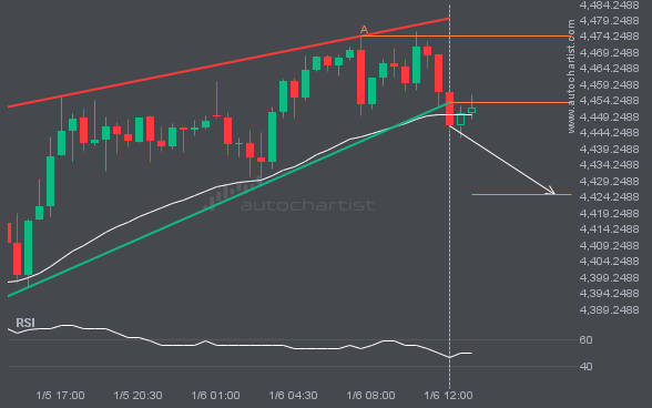 It would be prudent to confirm the breakout that just occurred. Do you consider the move through support significant? Do you have indicators confirming that the price momentum will continue? If so, aim for a target of 4424.8915, but consider reducing your position size as the price approaches that target.