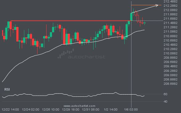 GBPJPY is once again retesting a key horizontal resistance level at 211.5930. This level has been tested 5 times recently and could see another bounce, as it did last time. However, after so many attempts, it may be ready to start a new trend.