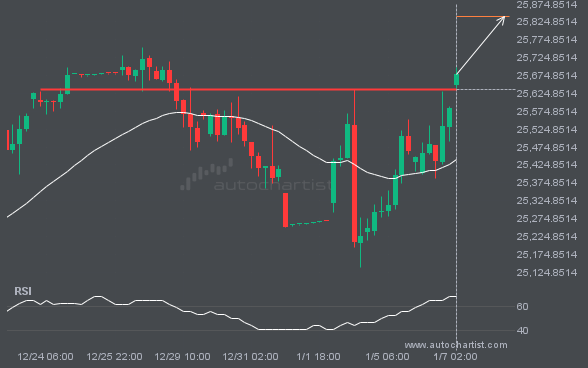 NAS100 has broken through a resistance line. Because it has previously retraced from this price, you should wait for confirmation of the breakout before trading. It has touched this line multiple times over the past 15 days, which suggests a possible target around 25839.7754 within the next 3 days.