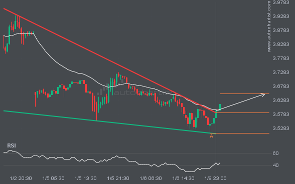 Falling Wedge pattern identified on NGC/USD has broken through a resistance level, with price momentum continuing to move upward. This presents a solid trading opportunity, with the price expected to reach 3.6524 in the next 15.