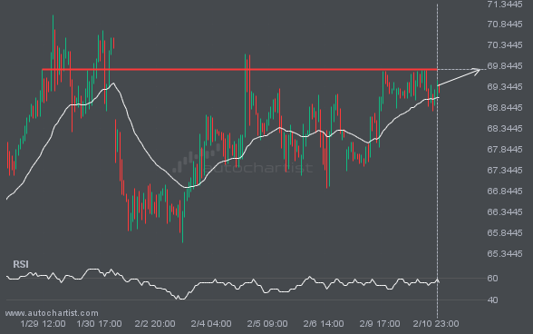 BRN/USD is approaching the line at 69.7610. If this move continues, the price of BRN/USD could test 69.7610 within the next 2 days. But do not rush to trade. It has tested this line many times in the past, so the move could be short-lived and end in a rebound.