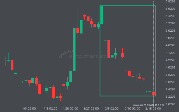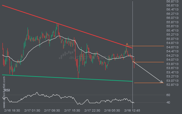 The last 12 4 hour candles on BRN/USD have formed a Descending Triangle pattern and broken out through the pattern lines, indicating a possible bearish movement toward the price level at 66.1395.