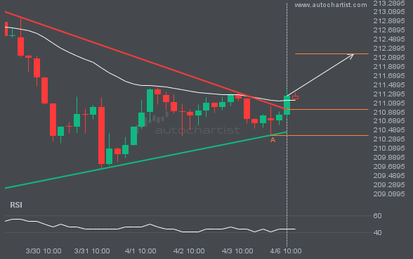 GBPJPY has broken through the resistance line, which it has tested twice before. We have seen it retrace from this line before, so wait for confirmation of the breakout before trading. If this new trend persists, a target level around 212.1622 may materialize within the next 2 days.