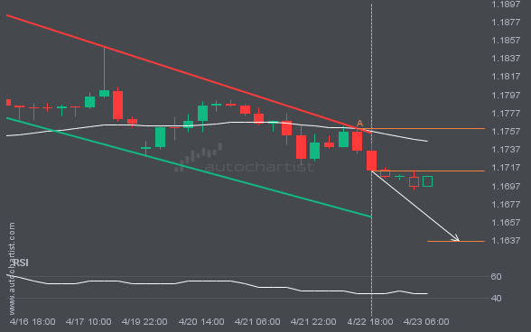 EURUSD is moving toward a support line. Since it has retraced from this line before, we may see either a breakout through it or a rebound to current levels. It has touched this line multiple times in the past 7 days and may test it again within the next 15 hours.