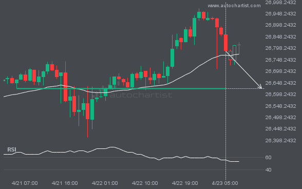 NAS100 is moving toward a key support level at 26623.2422. This level has been tested before for NAS100. This may present a good trading opportunity either at the spot price or after a breakout through this level.