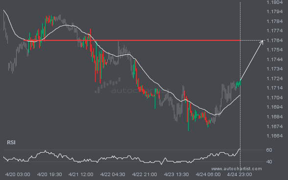 GBPJPY is heading toward the resistance line in a Triangle pattern. If this move continues, the price of GBPJPY could test 215.6588 within the next 3 days. It has tested this line many times before, so the move could be short-lived and may rebound as it has before.