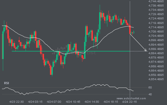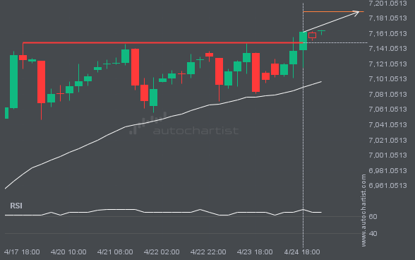S&P500 has broken through the support line of a Triangle technical chart pattern. Because it has retraced from this line in the past, you should wait for confirmation of the breakout before taking any action. It has touched this line twice in the last 15 days, which suggests a possible target around 6977.1544 within the […]