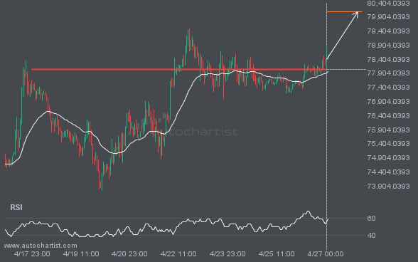 An emerging Rising Wedge pattern in its final wave has been identified on the BTCUSD 4 hour chart. After a strong bullish run, BTCUSD is heading toward the upper triangle trendline, with possible resistance at 80134.8675. If the resistance holds, the Rising Wedge pattern suggests a rebound toward current levels.