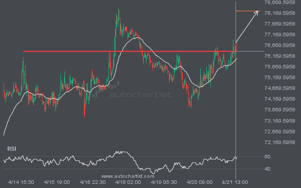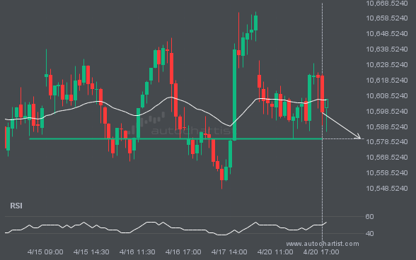FTSE100 has broken through the resistance line of a Pennant technical chart pattern. Because it has retraced from this line in the past, you should wait for confirmation of the breakout before taking any action. It has touched this line twice in the last 22 days, which suggests a possible target around 10716.3348 within the […]