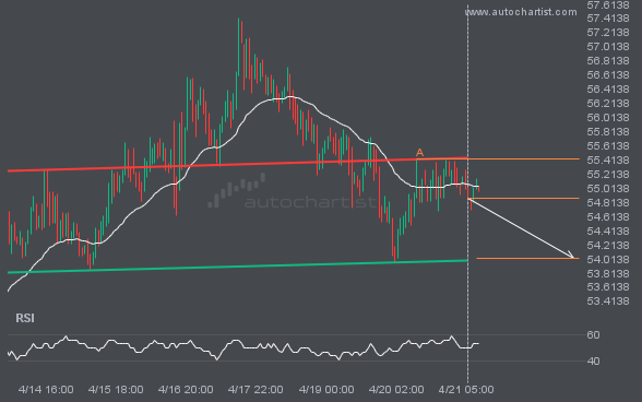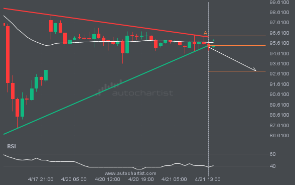 BRN/USD has broken through the support line of a Triangle technical chart pattern. Because it has retraced from this line in the past, you should wait for confirmation of the breakout before taking any action. It has touched this line twice in the last 17 days, suggesting a possible target level around 84.2973 within the […]