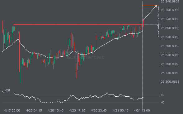 S&P500 has broken through the resistance line of a Ascending Triangle technical chart pattern. Because it has retraced from this line in the past, you should wait for confirmation of the breakout before taking any action. It has touched this line twice in the last 4 days, which suggests a possible target around 7137.4023 within […]