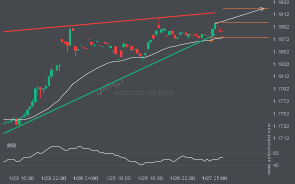 EURUSD is moving toward a resistance line it has tested many times. It has retraced from this line before, so it’s unclear whether it will break through or rebound again. If EURUSD continues on its current trajectory, it could reach 1.1922 within the next 9 hours.