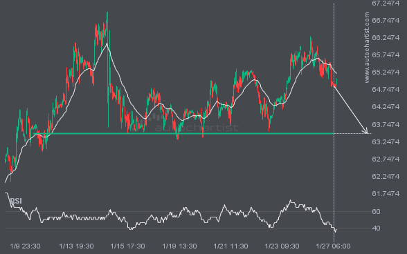 BRN/USD is moving toward a support line. Because it has retraced from this level in the past, we may see either a breakout through this line or a rebound to current levels. It has touched this line multiple times over the last 16 days and may test it again within the next 3 days.