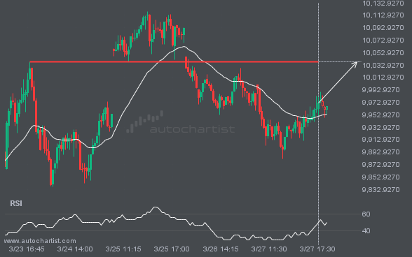 FTSE100 is about to retest a key horizontal resistance level near 10037.7598. It has tested this level 3 times recently and may simply bounce off it, as it did last time. However, after so many attempts, it may be ready to start a new trend.
