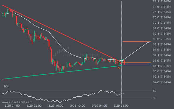 BTCUSD has broken through a resistance line of the Triangle chart pattern. If this breakout holds, we may see the price of BTCUSD test 68370.9975 within the next 2 days. But don’t rush to trade. It has tested this line before, so confirm the breakout before taking any action.