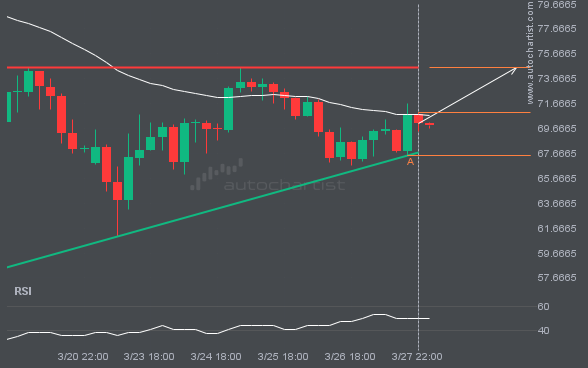 An emerging Ascending Triangle pattern in its final wave has been identified on the XAGUSD 4 hour chart. After a strong bullish run, XAGUSD is heading toward the upper triangle trendline, with possible resistance at 74.5792. If the resistance holds, the Ascending Triangle pattern suggests a rebound toward current levels.