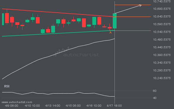 FTSE100 has broken through the resistance line of a Pennant technical chart pattern. Because it has retraced from this line in the past, you should wait for confirmation of the breakout before taking any action. It has touched this line twice in the last 22 days, which suggests a possible target around 10716.3348 within the […]