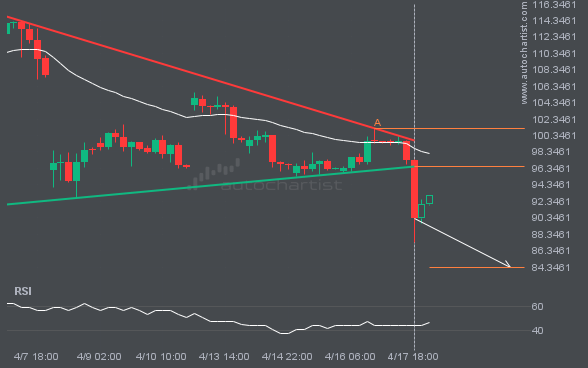 BRN/USD has broken through the support line of a Triangle technical chart pattern. Because it has retraced from this line in the past, you should wait for confirmation of the breakout before taking any action. It has touched this line twice in the last 17 days, suggesting a possible target level around 84.2973 within the […]