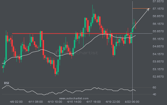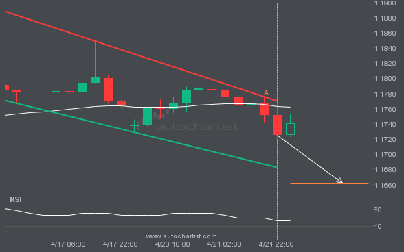 BRN/USD has broken through the support line of a Triangle technical chart pattern. Because it has retraced from this line in the past, you should wait for confirmation of the breakout before taking any action. It has touched this line twice in the last 5 days, which suggests a possible target around 92.8832 within the […]