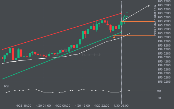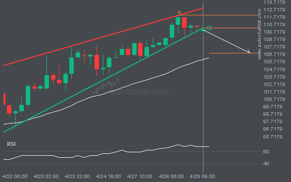 GBPJPY has broken through the support line of a Rising Wedge technical chart pattern. Because it has retraced from this line in the past, you should wait for confirmation of the breakout before taking any action. It has touched this line twice in the last 13 days, suggesting a possible target level around 214.5601 within […]