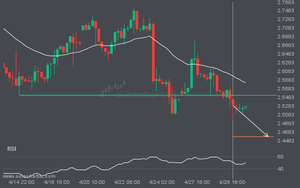 EURUSD is moving toward a support line. Since it has retraced from this line before, we may see either a breakout through this line or a rebound to current levels. It has touched this line numerous times in the last 8 days and may test it again within the next 2 days.