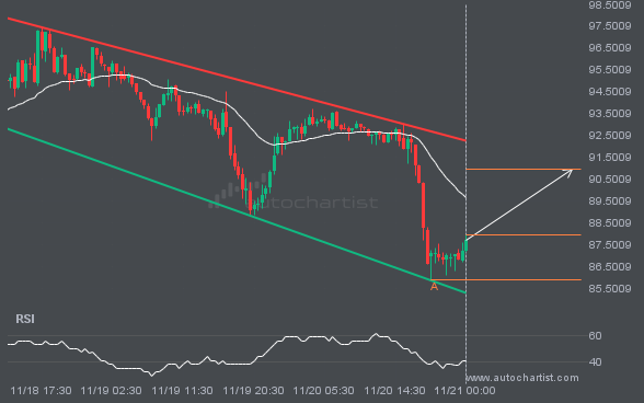 EURUSD is moving toward a support line it has tested many times. It has retraced from this line before, so it’s unclear whether it will break through or rebound again. If EURUSD continues on its current trajectory, it could reach 1.1487 within the next 7 hours.