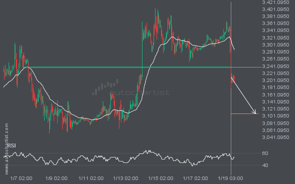 ETHUSD has broken through a support line. Since it has previously retraced from this price, wait for confirmation of the breakout before trading. It has touched this line several times over the past 13 days. This suggests a possible target around 3107.3479 within the next 3 days.