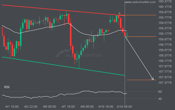 USDJPY was identified around 159.0765 after recently rebounding off the resistance on the 4 hour interval. Ultimately, the stock’s price action has formed a Channel Down pattern. This squeeze may increase the chances of a strong breakout. The projected move could take the price to around 157.4746.